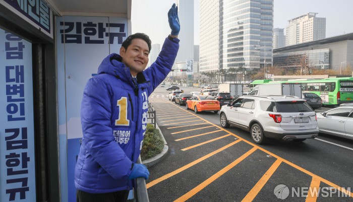 [서울=뉴스핌] 최상수 기자 = 김한규 더불어민주당 강남병 후보가 3일 오전 서울 강남구 봉은사역 인근에서 거리 유세를 펼치고 있다. 2020.04.03 kilroy023@newspim.com