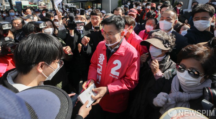 [서울=뉴스핌] 최상수 기자 = 황교안 미래통합당 종로구 후보가 4일 오후 서울 종로구 가회동 재동초등학교 앞 삼거리에서 한 시민에게 저서 '밤이 깊어 먼 길을 나섰습니다'에 서명을 해주고 있다. 2020.04.04 kilroy023@newspim.com