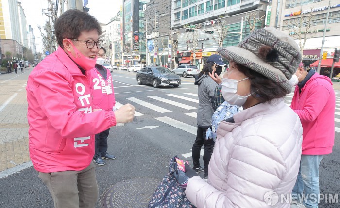 [서울=뉴스핌] 윤창빈 기자 = 유경준 미래통합당 강남구병 국회의원 후보가 7일 오전 서울 강남구 대치4동 일대에서 선거유세를 하고 있다. 2020.04.07 pangbin@newspim.com