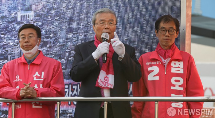 [성남=뉴스핌] 최상수 기자 = 김종인 미래통합당 총괄선대위원장이 7일 오후 경기도 성남시 수정구 단대오거리역 인근에서 신상진 중원구, 염오봉 수정구 후보에 대한 지원 유세를 펼치고 있다. 2020.04.07 kilroy023@newspim.com