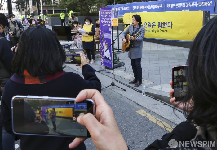 [서울=뉴스핌] 이한결 기자 = 가수 허영택이 8일 오후 서울 종로구 옛 주한 일본대사관 앞 평화로에서 코로나19 확산 방지를 위해 온라인 집회로 열린 ‘제1434차 일본군성노예제 문제해결을 위한 정기 수요시위’에서 공연을 펼치고 있다. 2020.04.08 alwaysame@newspim.com