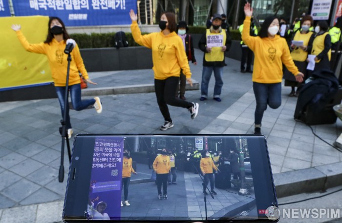[서울=뉴스핌] 이한결 기자 = 8일 오후 서울 종로구 옛 주한 일본대사관 앞 평화로에서 코로나19 확산 방지를 위해 온라인 집회로 열린 ‘제1434차 일본군성노예제 문제해결을 위한 정기 수요시위’에서 정의기억연대 관계자들이 공연을 펼치고 있다. 2020.04.08 alwaysame@newspim.com