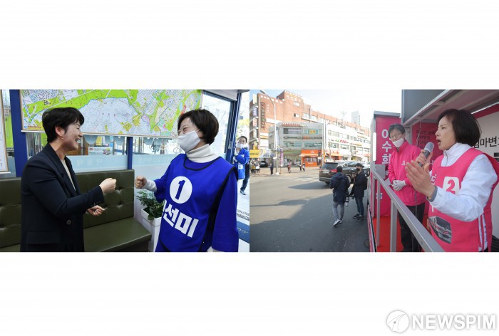 [서울=뉴스핌] 윤창빈 기자 = 진선미 더불어민주당 서울 강동구갑 국회의원 후보(왼쪽부터), 이수희 미래통합당 서울 강동구갑 국회의원 후보가 9일 오후 서울 강동구 일대에서 선거 유세를 하고 있다. 2020.04.09 pangbin@newspim.com