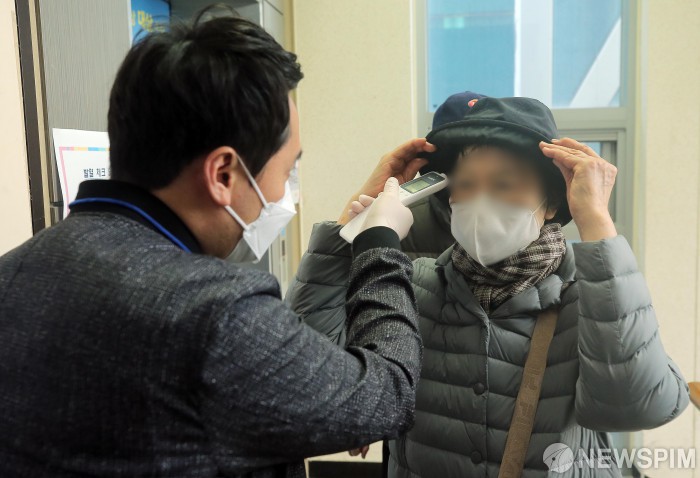 [서울=뉴스핌] 윤창빈 기자 = 제21대 국회의원 선거 사전투표가 시작된 10일 오전 서울 동작구 흑석동 주민센터에서 유권자들이 코로나19 확산 방지를 위해 체온측정을 하고 있다. 2020.04.10 pangbin@newspim.com