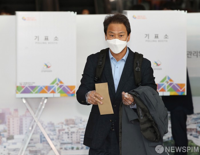 [서울=뉴스핌] 정일구 기자 = 임종석 전 청와대 비서실장이 제21대 국회의원 선거 사전투표 첫날인 10일 오전 서울 용산구 서울역에 마련된 남영동 사전투표소를 찾아 투표를 마친 후 투표함에 용지를 넣고 있다. 2020.04.10 mironj19@newspim.com