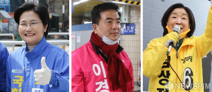 [고양=뉴스핌] 최상수 기자 = 문명순 더불어민주당, 이경환 미래통합당, 심상정 정의당 고양갑 후보가 10일 경기도 고양시 화정역 인근에서 선거 유세를 펼치고 있다. 2020.04.10 kilroy023@newspim.com