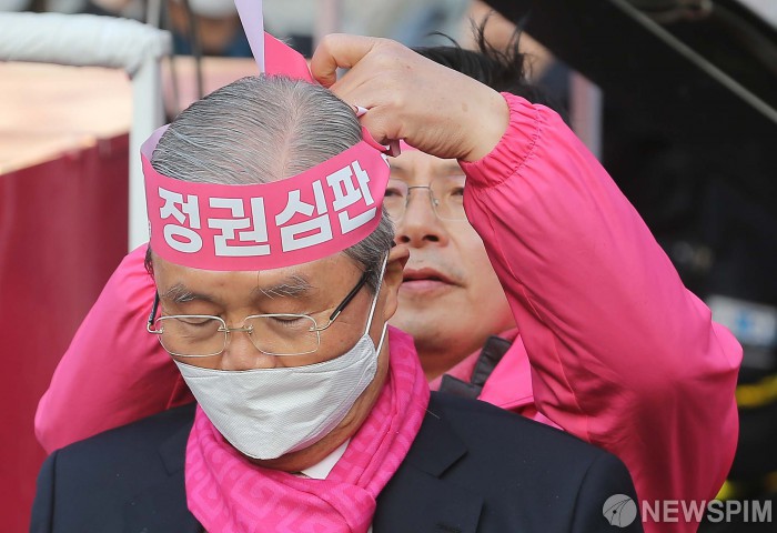 [서울=뉴스핌] 윤창빈 기자 = 황교안 미래통합당 서울 종로구 국회의원 후보가 11일 오후 서울 종로구 혜화역 인근에서 열린 선거 유세에서 김종인 미래통합당 총괄 선거대책위원장의 머리띠를 둘러주고 있다. 2020.04.11 pangbin@newspim.com