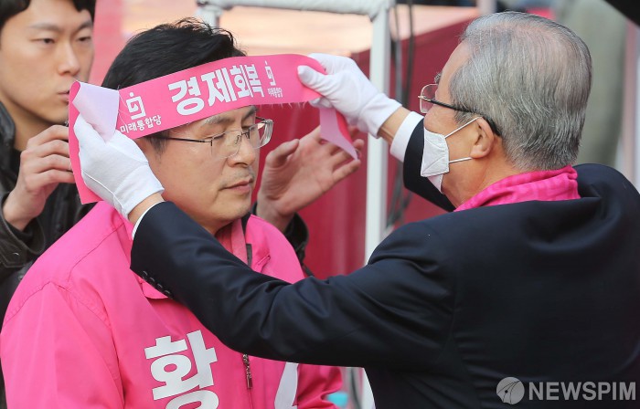 [서울=뉴스핌] 윤창빈 기자 = 김종인 미래통합당 총괄 선거대책위원장이 11일 오후 서울 종로구 혜화역 인근에서 열린 선거 유세에서 황교안 미래통합당 서울 종로구 국회의원 후보의 머리띠를 둘러주고 있다. 2020.04.11 pangbin@newspim.com