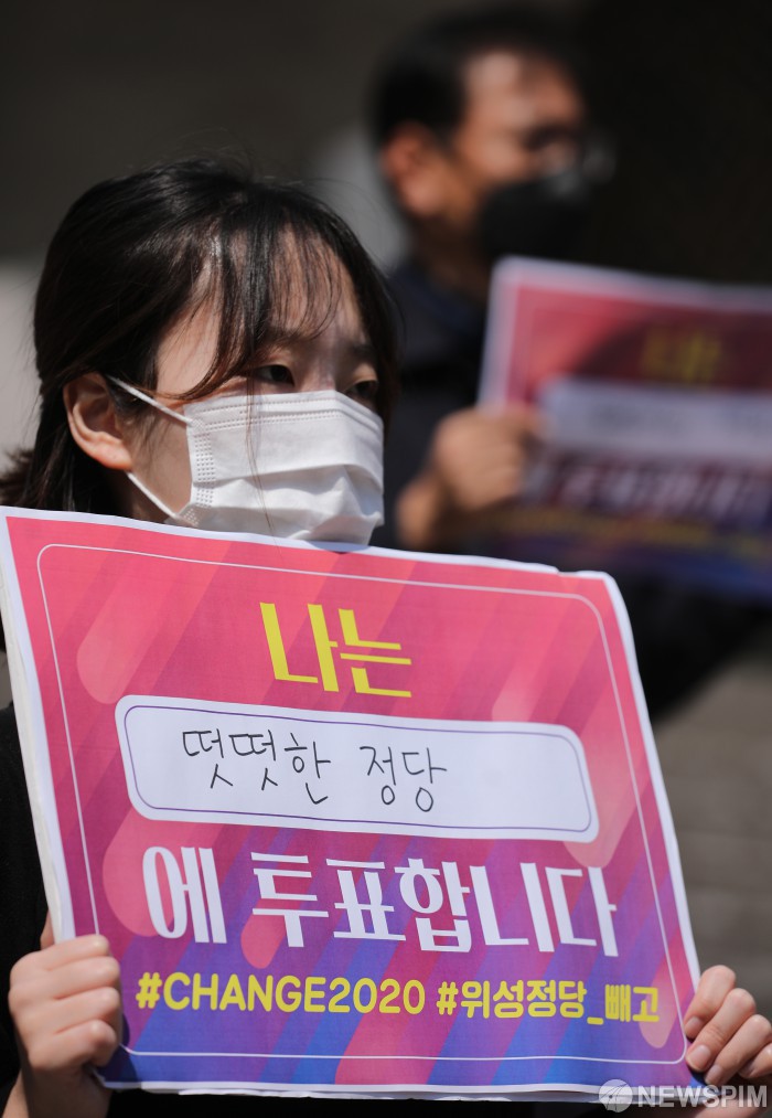 [서울=뉴스핌] 백인혁 기자 = 제21대 국회의원 선거를 하루 앞둔 14일 오전 서울 종로구 세종문화회관 계단 앞에서 2020총선시민네트워크 회원들이 유권자 투표 참여 호소 기자회견을 하고 있다. 2020총선넷 참여단체들은 퇴행하는 정치를 바꾸고 한국 사회의 희망을 만들기 위해서는 더 많은 유권자들이 총선에 참여해야하고, 이를 위해 유권자들께 투표참여를 호소하기 위해 기자회견을 진행했다고 밝혔다. 2020.04.14 dlsgur9757@newspim.com