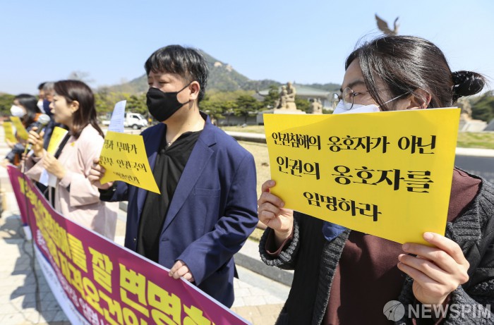 [서울=뉴스핌] 이한결 기자 = 명숙 인권운동네트워크 바람 활동가가 14일 오전 서울 종로구 청와대 분수대 앞에서 인권운동더하기와 차별금지법제정연대에 의해 열린 ‘홍관표 교수 법무부 인권국장 임명 시도 반대 인권단체 기자회견’에서 발언을 하고 있는 가운데 참가자들이 손 팻말을 들고 있다. 2020.04.14 alwaysame@newspim.com