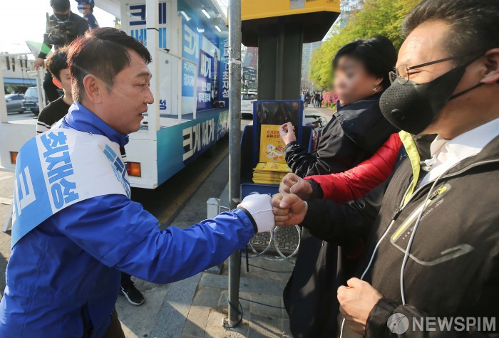 [서울=뉴스핌] 윤창빈 기자 = 최재성 더불어민주당서울 송파구을 국회의원 후보가 14일 오후 서울 송파구의 새마을전통시장 앞에서 선거 유세를 하고 있다. 2020.04.14 pangbin@newspim.com