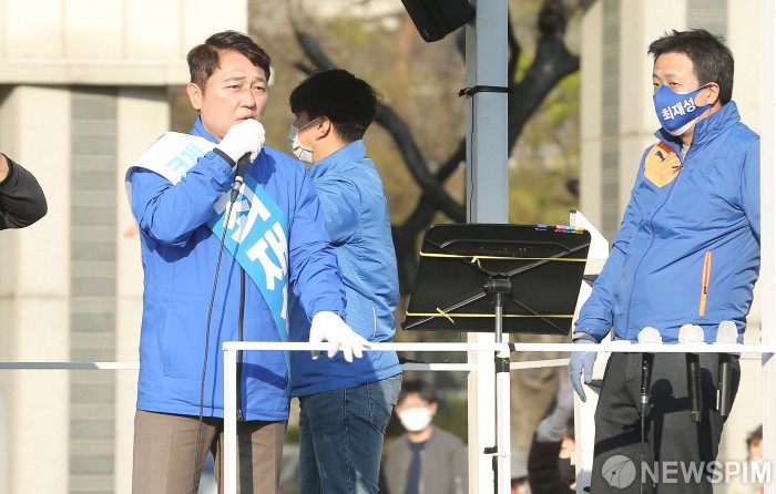 [서울=뉴스핌] 윤창빈 기자 = 최재성 더불어민주당 서울 송파구을 국회의원 후보가 14일 오후 서울 송파구의 새마을전통시장 앞에서 선거 유세를 하고 있다. 2020.04.14 pangbin@newspim.com