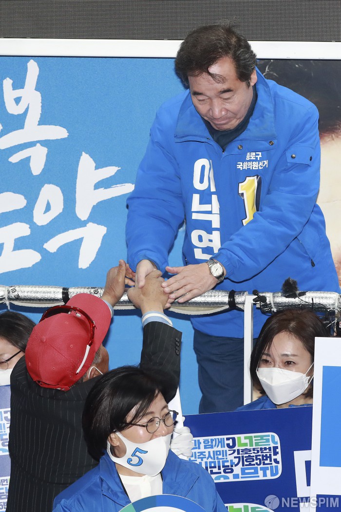 [서울=뉴스핌] 이형석 기자 = 이낙연 더불어민주당 상임선거대책위원장이 14일 오후 서울 종로구 동묘앞역 앞에서 열린 선거유세에서 지지자와 악수를 하고 있다. 2020.04.14 leehs@newspim.com