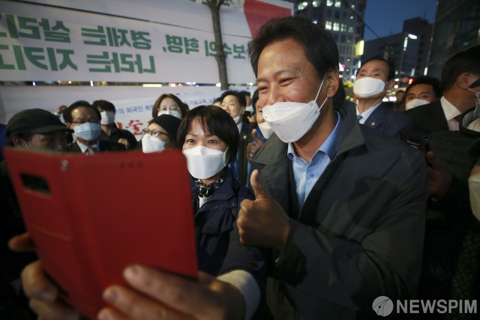 [서울=뉴스핌] 이형석 기자 = 임종석 전 대통령 비서실장이 14일 오후 서울 종로구 동묘앞역 앞에서 열린 이낙연 상임선거대책위원장의 선거유세에 참석해 지지자와 사진을 찍고 있다. 2020.04.14 leehs@newspim.com