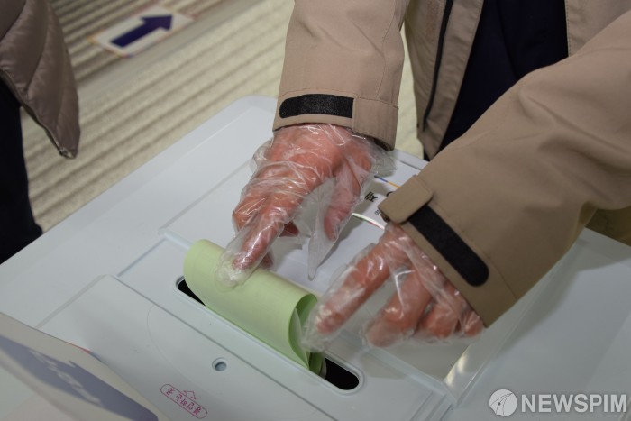 [광주=뉴스핌] 전경훈 기자 = 제21대 국회의원 선거가 실시된 15일 오전 광주 서구 서광초등학교에 마련된 투표소에서 한 유권자가 투표를 하고 있다. 2020.04.15 kh10890@newspim.com