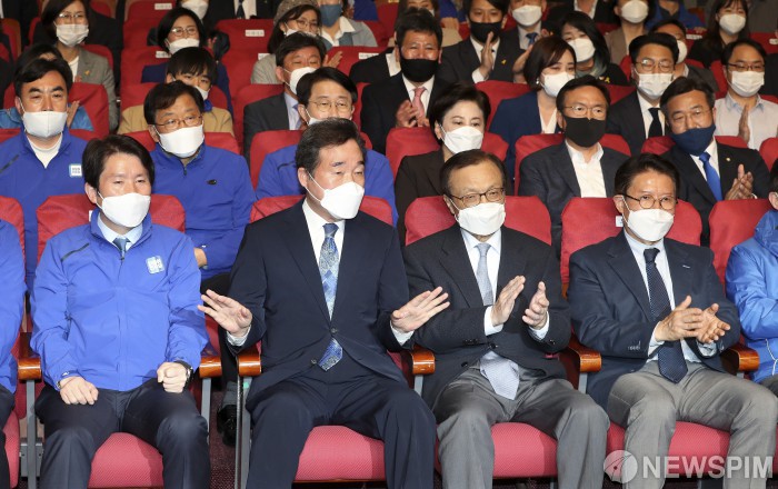[서울=뉴스핌] 이형석 기자 = 이해찬, 이낙연 더불어민주당 공동상임선대위원장이 4.15총선 투표일인 15일 오후 서울 여의도 국회 의원회관에 마련된 21대 국회의원선거 더불어민주당 개표상황실에서 개표방송을 바라보고 있다. 왼쪽부터 이인영 더불어민주당 원내대표, 이낙연, 이해찬 더불어민주당 공동상임선대위원장, 우희종, 더불어시민당 공동상임선대위원장. 2020.04.15 leehs@newspim.com