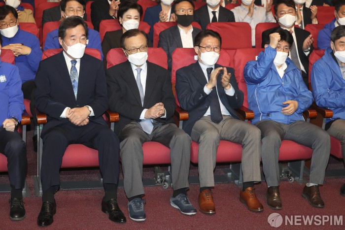 [서울=뉴스핌] 이형석 기자 = 이해찬, 이낙연 더불어민주당 공동상임선대위원장이 4.15총선 투표일인 15일 오후 서울 여의도 국회 의원회관에 마련된 21대 국회의원선거 더불어민주당 개표상황실에서 개표방송을 바라보고 있다. 2020.04.15 leehs@newspim.com