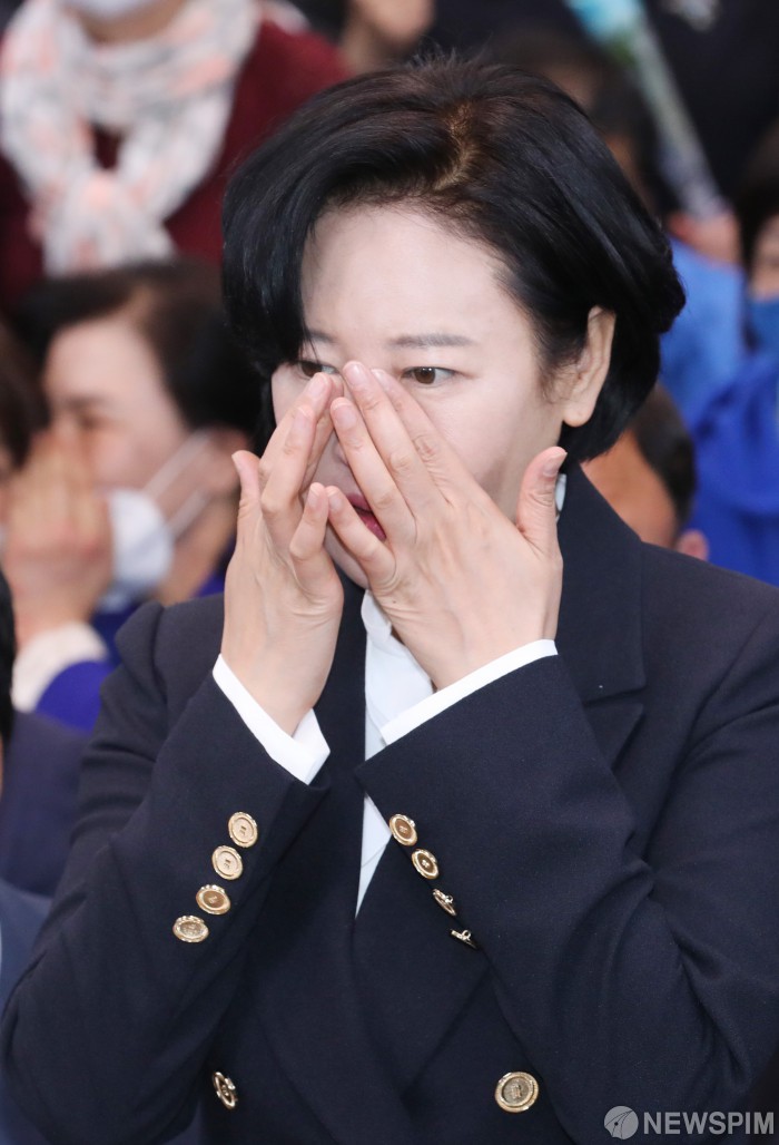 [서울=뉴스핌] 백인혁 기자 = 이수진 더불어민주당 동작구을 후보가 당선이 확실시되자 16일 오전 서울 동작구 사당동에 마련된 선거사무소에서 당선소감을 밝히던 중 눈물을 훔치고 있다. 2020.04.16 dlsgur9757@newspim.com