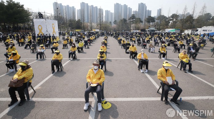 [안산=뉴스핌] 윤창빈 기자 = 16일 오후 경기도 안산시 화랑유원지 제3주차장에서 열린 세월호 참사 6주기 기억식에서 유가족들이 사회적 거리를 두며 좌석에 앉아있다. 2020.04.16 pangbin@newspim.com