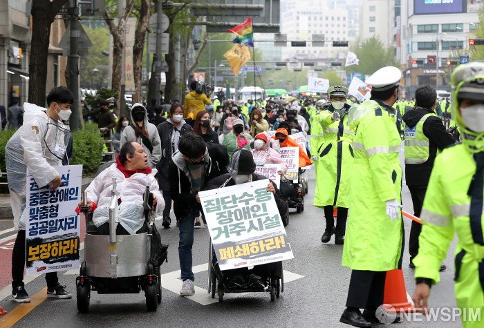 [서울=뉴스핌] 정일구 기자 = 420 장애인차별철폐공동투쟁단 관계자들이 20일 오후 서울 종로구 광화문 광장에서 마로니에공원 방향으로 420 장애인의 날 장애인 차별 철폐 행진을 하고 있다. 2020.04.20 mironj19@newspim.com