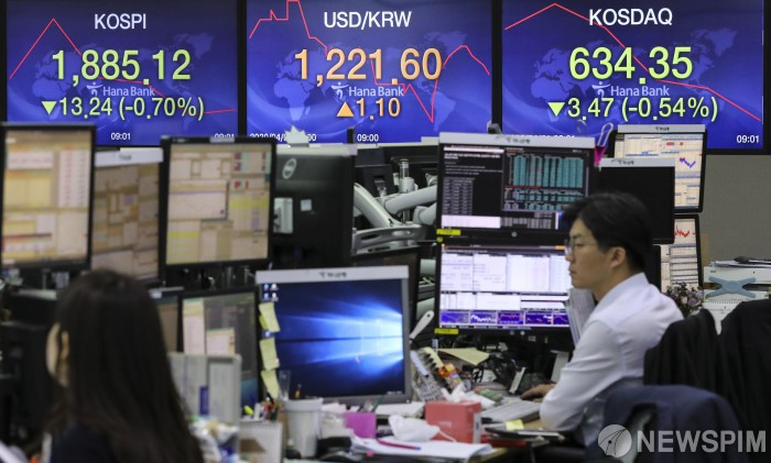 [서울=뉴스핌] 이한결 기자 = 미국 서부텍사스원유(WTI) 선물 가격이 사상 처음으로 0달러 이하로 폭락한 21일 오전 코스피 지수가 전 거래일 대비 11.58포인트(0.61%) 내린 1,886.78에 개장했다. 코스닥 지수는 3.06포인트(0.48%) 내린 634.77에 출발했고 달러/원 환율은 1.5원 오른 1,222.0원에 장을 시작했다. 이날 서울 중구 하나은행 딜링룸에서 딜러들이 업무를 보고 있다. 2020.04.21 alwaysame@newspim.com