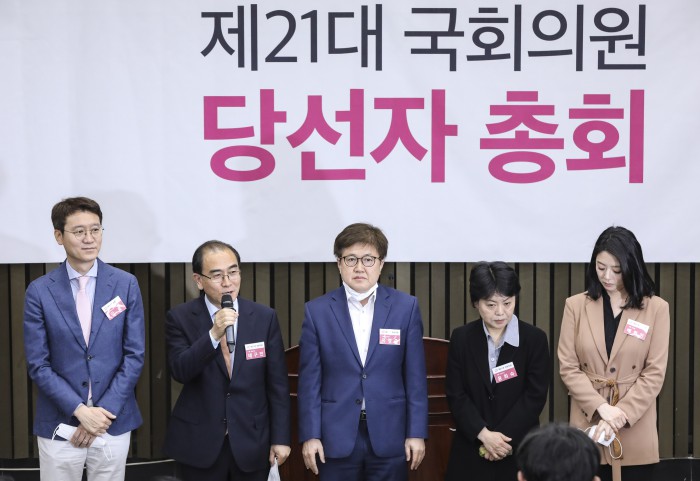 [서울=뉴스핌] 이한결 기자 = 태구민(본명 태영호) 미래통합당 당선인이 28일 오전 서울 여의도 국회의사당에서 열린 미래통합당 제21대 국회의원 당선자 총회에서 인사말을 하고 있다. 2020.04.28 alwaysame@newspim.com