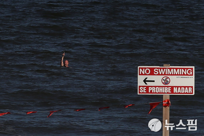 | [갤버스턴 로이터=뉴스핌] 박우진 기자 = 26일(현지시간) 미국 텍사스주 갤버스턴의 해변에서 '수영 금지' 푯말이 있음에도 한 남성이 바다에 뛰어들었다. 주 정부는 코로나19 확산 방지를 위해 해변에 폐쇄 조치를 내렸다. 2020.04.26 krawjp@newspim.com |