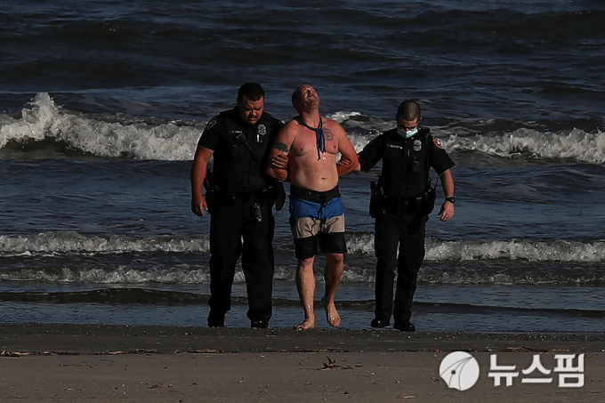 | [갤버스턴 로이터=뉴스핌] 박우진 기자 = 26일(현지시간) 미국 텍사스주 갤버스턴의 해변에서 한 남성이 코로나19 확산 방지를 위해 주 정부가 내린 해변 폐쇄 조치를 어기고 바다에 뛰어들었다가 경찰에 붙잡혔다. 2020.04.26 krawjp@newspim.com |