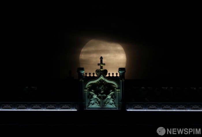 [런던 로이터=뉴스핌] 김사헌 기자 = 2020년50월7일 슈퍼문(플라워문) 보름달이 영국 런던 타워브리지 위로 떠오르고 있다. 2020.05.08 herra79@newspim.com