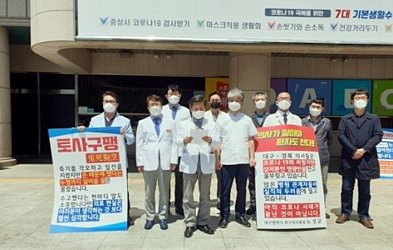 14일 대구시의사회에 따르면 이성구 회장 등 의사 10여명은 전날 대구시청 앞에서 "병원이 죽어가고 있다"며 "코로나19 이후 지원 대책을 마련해줄 것"을 촉구했다.