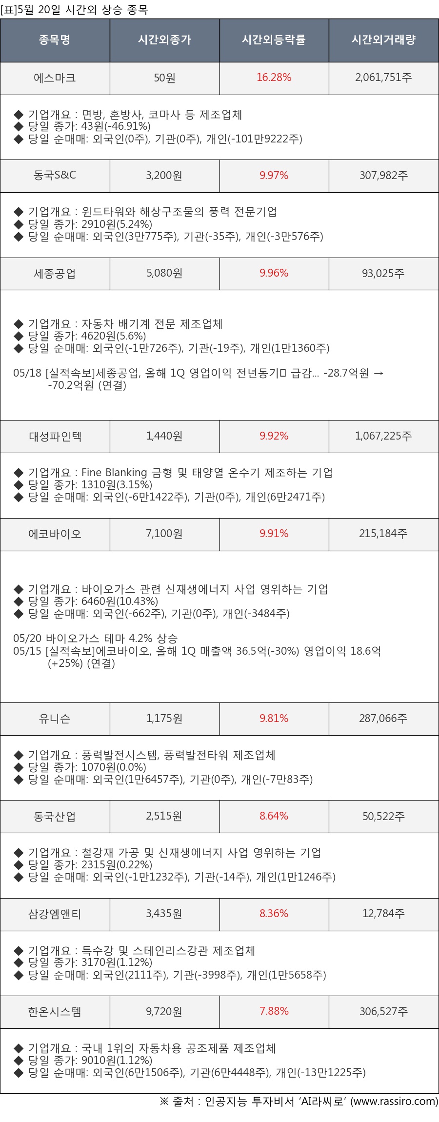 [표]5월 20일 시간외 상승 종목 및 최근 동향