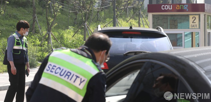 [고양=뉴스핌] 최상수 기자 = 쿠팡 고양물류센터에서 사무직으로 일하는 직원이 지난 27일 확진 판정을 받은 가운데 29일 오전 경기도 고양시 덕양구 쿠팡 고양물류센터에서 경비 관계자들이 차량을 통제하고 있다. 2020.05.29 kilroy023@newspim.com