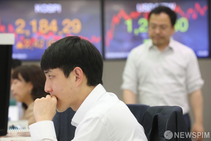 [서울=뉴스핌] 백인혁 기자 = 코스피 지수가 전 거래일 대비 2.42포인트(0.11%)오른, 2,184.29에 마감했다. 달러·원 환율은 전날보다 2.3원 내린 1204.8원에 마감했고 코스닥 지수는 전 거래일 대비 3.73포인트(0.50%)오른 753.04에 마감했다. 이날 서울 중구 하나은행 딜링룸에서 딜러들이 업무를 보고 있다. 2020.06.08 dlsgur9757@newspim.com