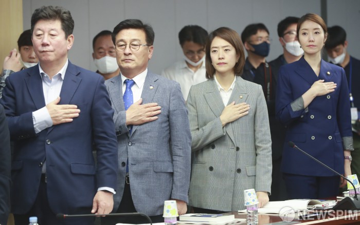 [서울=뉴스핌] 이형석 기자 = 고민정 더불어민주당 의원(오른쪽 두번째)이 9일 오후 서울 여의도 국회 의원회관에서 '우후죽순' 제1차 정기토론회-새로운 미래와 한국 경제·사회 : 무엇을 할 것인가? 세미나에서 국민의례를 하고 있다. 2020.06.09 leehs@newspim.com