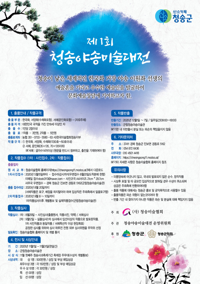 윤경희 청송군수는 "이번 공모전이 문화예술의 고장 청송군을 더욱 알리는 계기가 되길 기대한다"고 밝혔다.