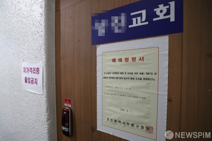 [인천=뉴스핌] 김학선 기자 = 인천, 경기 등 수도권 개척교회와 관련해 신종 코로나바이러스 감염증(코로나19) 누적 확진자가 100명을 넘어서며 확산하는 가운데 14일 오전 확진자가 발생한 인천시 부평구의 모 교회 출입문에 폐쇄명령서가 붙어 있다. 2020.06.14 yooksa@newspim.com