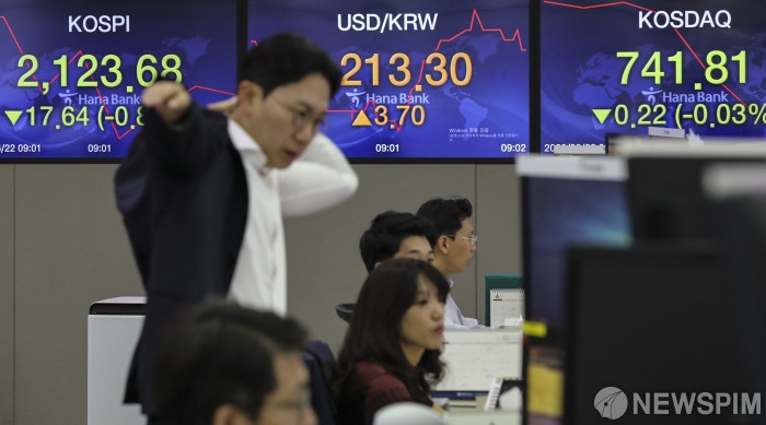 [서울=뉴스핌] 이한결 기자 = 미국에서 코로나19 확진자가 연이틀 3만명을 돌파한 22일 오전 코스피 지수가 전 거래일 대비 14.94포인트(0.70%) 내린 2,126.38에 개장했다. 코스닥 지수는 0.95포인트(0.13%) 오른 742.98에 출발했고 달러/원 환율은 3.8원 오른 1,213.4원에 장을 시작했다. 이날 서울 중구 하나은행 딜링룸에서 딜러들이 업무를 보고 있다. 2020.06.22 alwaysame@newspim.com