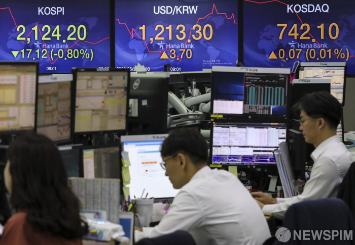 [서울=뉴스핌] 이한결 기자 = 미국에서 코로나19 확진자가 연이틀 3만명을 돌파한 22일 오전 코스피 지수가 전 거래일 대비 14.94포인트(0.70%) 내린 2,126.38에 개장했다. 코스닥 지수는 0.95포인트(0.13%) 오른 742.98에 출발했고 달러/원 환율은 3.8원 오른 1,213.4원에 장을 시작했다. 이날 서울 중구 하나은행 딜링룸에서 딜러들이 업무를 보고 있다. 2020.06.22 alwaysame@newspim.com