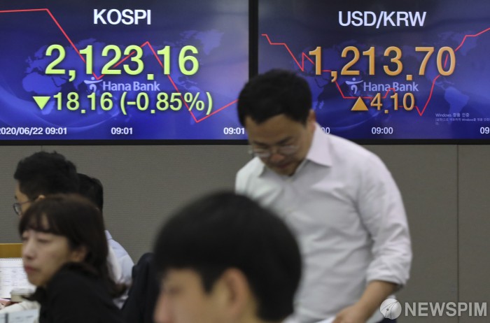 [서울=뉴스핌] 이한결 기자 = 미국에서 코로나19 확진자가 연이틀 3만명을 돌파한 22일 오전 코스피 지수가 전 거래일 대비 14.94포인트(0.70%) 내린 2,126.38에 개장했다. 코스닥 지수는 0.95포인트(0.13%) 오른 742.98에 출발했고 달러/원 환율은 3.8원 오른 1,213.4원에 장을 시작했다. 이날 서울 중구 하나은행 딜링룸에서 딜러들이 업무를 보고 있다. 2020.06.22 alwaysame@newspim.com