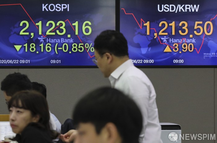 [서울=뉴스핌] 이한결 기자 = 미국에서 코로나19 확진자가 연이틀 3만명을 돌파한 22일 오전 코스피 지수가 전 거래일 대비 14.94포인트(0.70%) 내린 2,126.38에 개장했다. 코스닥 지수는 0.95포인트(0.13%) 오른 742.98에 출발했고 달러/원 환율은 3.8원 오른 1,213.4원에 장을 시작했다. 이날 서울 중구 하나은행 딜링룸에서 딜러들이 업무를 보고 있다. 2020.06.22 alwaysame@newspim.com