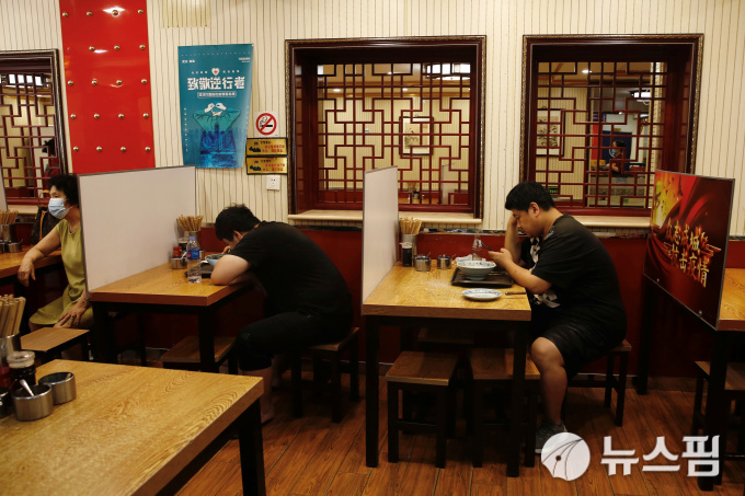 | [베이징 로이터=뉴스핌] 최원진 기자= 중국 베이징의 한 식당에서 손님들이 가림막을 앞에 두고 식사를 하고 있다. 가림막은 코로나19(COVID-19) 확산 방지를 위해 설치됐다. 2020.06.22 wonjc6@newspim.com |
