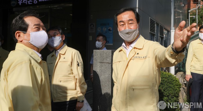 [서울=뉴스핌] 최상수 기자 = 정세균 국무총리(오른쪽)가 22일 오후 서울 서대문구 보건소에 마련된 선별진료소를 방문하여 문석진 구청장의 설명을 경청하고 있다. 2020.06.22 kilroy023@newspim.com