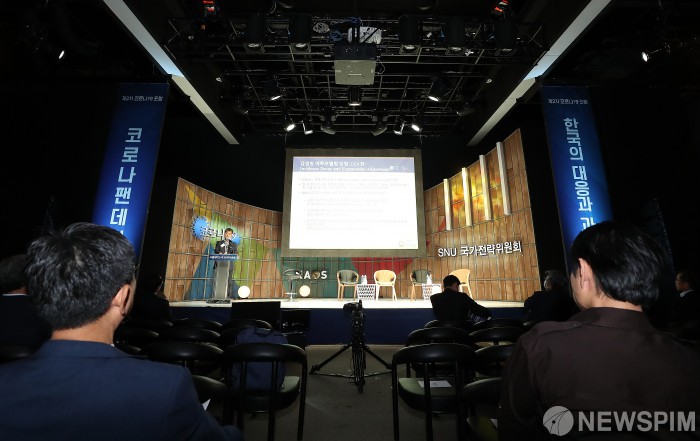 [서울=뉴스핌] 정일구 기자 = 전영일 통계개발원 원장이 24일 오후 서울 용산구 블루스퀘어에서 서울대학교 국가전략위원회와 카오스재단 주최로 열린 제2차 코로나19 포럼 '코로나 팬데믹, 한국의 대응과 과제Ⅱ'에서 주제발표를 하고 있다. 2020.06.24 mironj19@newspim.com