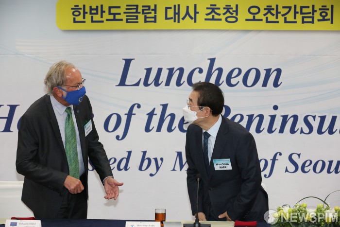 [서울=뉴스핌] 백인혁 기자 = 박원순 서울시장(오른쪽)이 25일 오후 서울 중구 서울시청에서 열린 '서울시장-한반도클럽[남북겸임대사] 초청 오찬간담회'에서 미하엘 라이터러 주한 EU대사와 대화를 나누고 있다. 2020.06.25 dlsgur9757@newspim.com