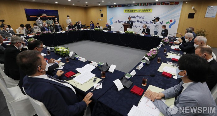 [서울=뉴스핌] 백인혁 기자 = 박원순 서울시장이 25일 오후 서울 중구 서울시청에서 열린 '서울시장-한반도클럽[남북겸임대사] 초청 오찬간담회'에서 환영사를 하고 있다. 2020.06.25 dlsgur9757@newspim.com