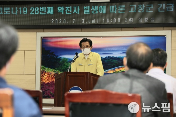 [고창=뉴스핌] 이백수 기자 = 전북 고창군 유기상 고창군수는 군청 2층 상황실에서 긴급 브리핑을 갖고 "그간 지역사회 전파방지에 전력을 다해 왔지만 오늘 우려했던 고창군 첫 확진자가 발생했다"면서 "타 지역 방문이나 예식장, 장례식장, 대형음식점 등 많은 사람들이 모이는 장소는 당분간 방문을 삼가고, 종교행사는 중단 및 온라인 예배로 진행해 줄 것을 부탁드린다"고 당부했다.