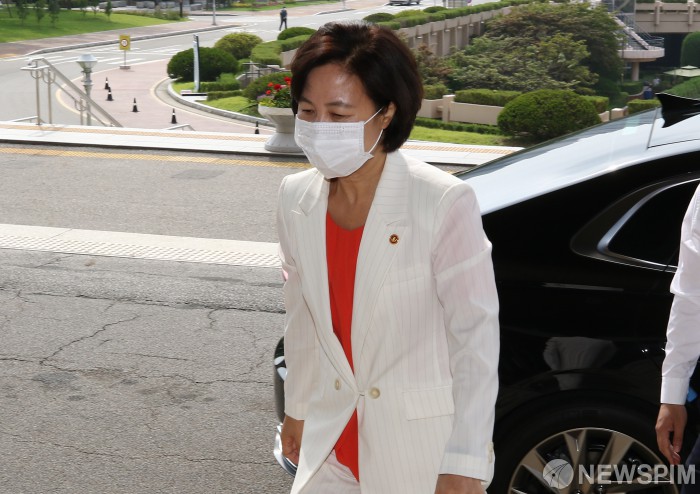 [과천=뉴스핌] 백인혁 기자 = 추미애 법무부 장관이 6일 오전 경기 과천시 법무부에 출근하고 있다. 지난 3일 추 장관의 '수사지휘권' 발동으로 윤 총장은 예정된 전문수사자문단 소집을 취소했지만, 수사지휘권 수용 여부를 밝히지 않은 채 이튿날 고검장·검사장 회의 소집으로 대응했다. 이후 주말 내내 숙고를 거듭한 윤 총장이 이르면 오늘(6일) 입장을 내놓을 것으로 보인다. 2020.07.06 dlsgur9757@newspim.com