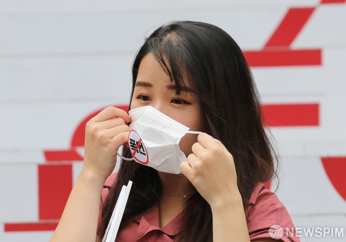 [서울=뉴스핌] 백인혁 기자 = 직장갑질119 회원들이 16일 오후 서울 종로구 세종문화회관 계단 앞에서 갑질금지법 시행 1년 기자회견에 앞서 마스크를 착용하고 있다. 2020.07.16 dlsgur9757@newspim.com