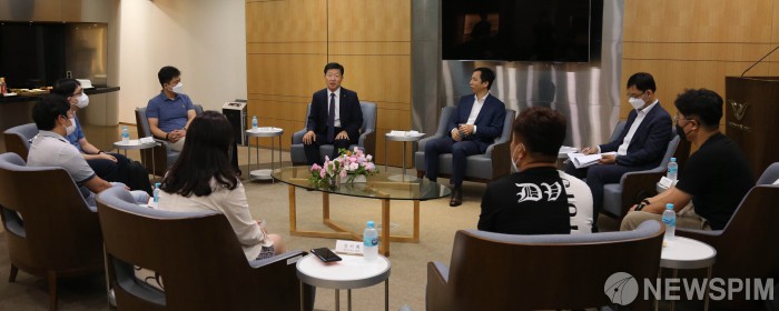 [서울=뉴스핌] 우태희 대한상의 상근부회장이 22일 인천공항에서 열린 베트남 특별입국 기업인 간담회에서 인사말을 하고 있다.대한상공회의소는 이날부터 국내 기업들의 글로벌 기업활동 애로해소를 위해 4천여명에 달하는 대규모 베트남 특별입국을 추진한다고 밝혔다. [사진=대한상공회의소] 2020.07.22 photo@newspim.com