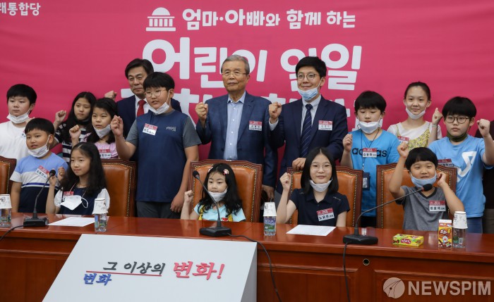 [서울=뉴스핌] 최상수 기자 = 김종인 미래통합당 비상대책위원장이 22일 오후 서울 여의도 국회에서 열린 '엄마, 아빠와 함께하는 어린이 일일정치체험학교'에서 어린이들과 기념촬영을 하고 있다. 2020.07.22 kiroy023@newspim.com